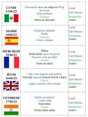 Voici une présentation des repas du 13 au 17 Juin, préparés par l'équipe du service restauration:
